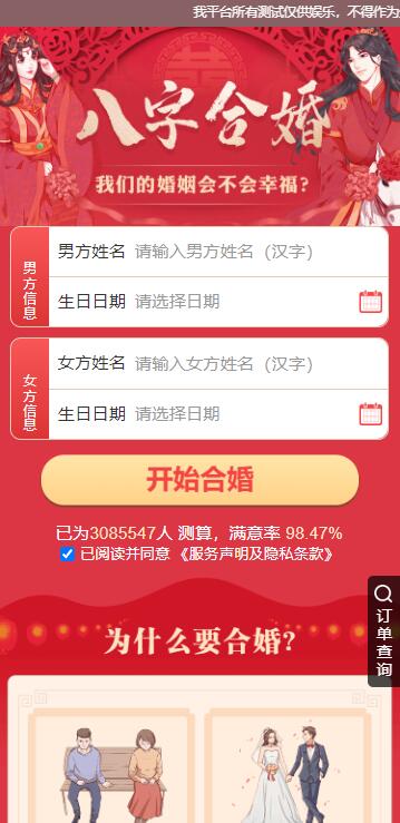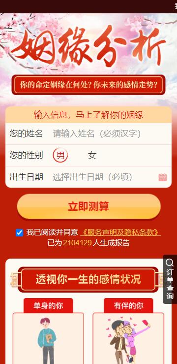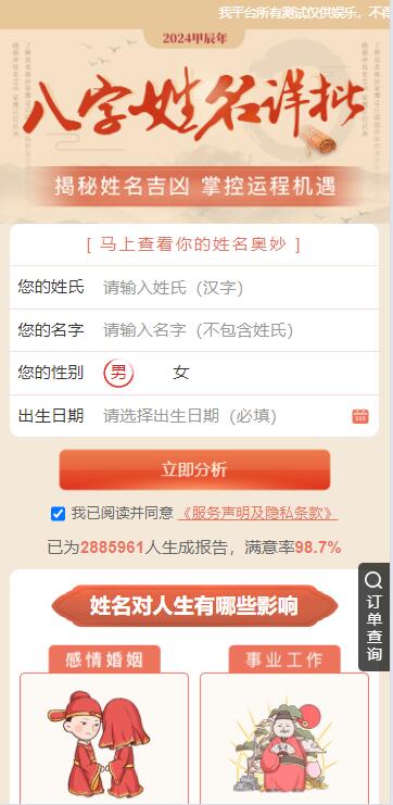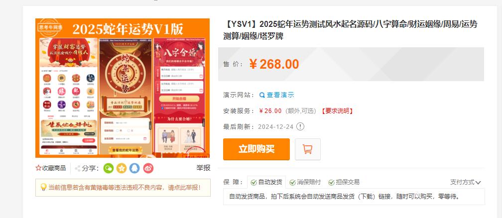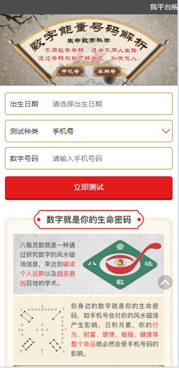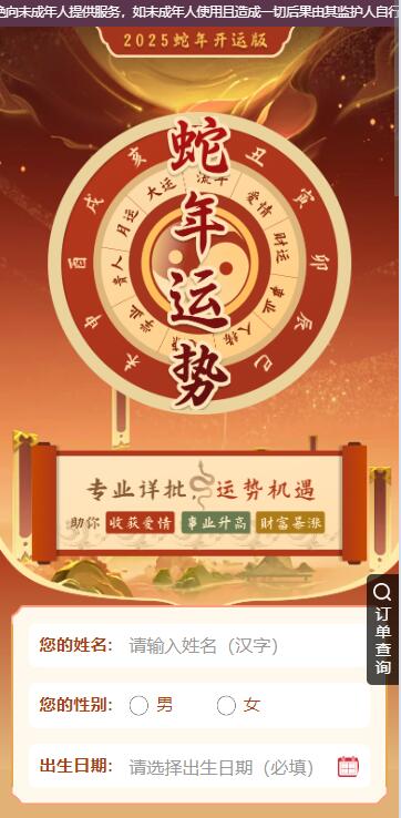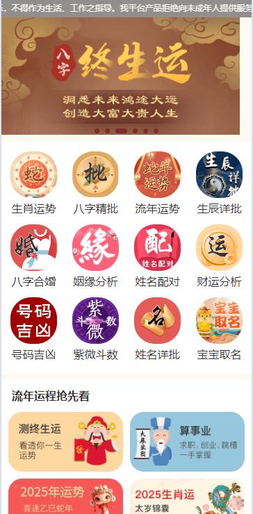 2025越来越多移动端智能应用的出现,将用户的需求不断的细化, 传统的命理占卜行业也要随时互联网的洪流随之前进,让用户可以足不出户即可享受八字测算的乐趣, 本源码为付费测算可以为你带来超强的变现能力。后疫情时代新风口! 主要功能介绍 可做单页推广,亦可作为其他综合页面推广! 本程序需要准备两个域名,二级域名也可以 系统内含其他测算项目,可根据需要开放 微信内访问需要自备微信服务号(也可以去掉微信访问环境)
