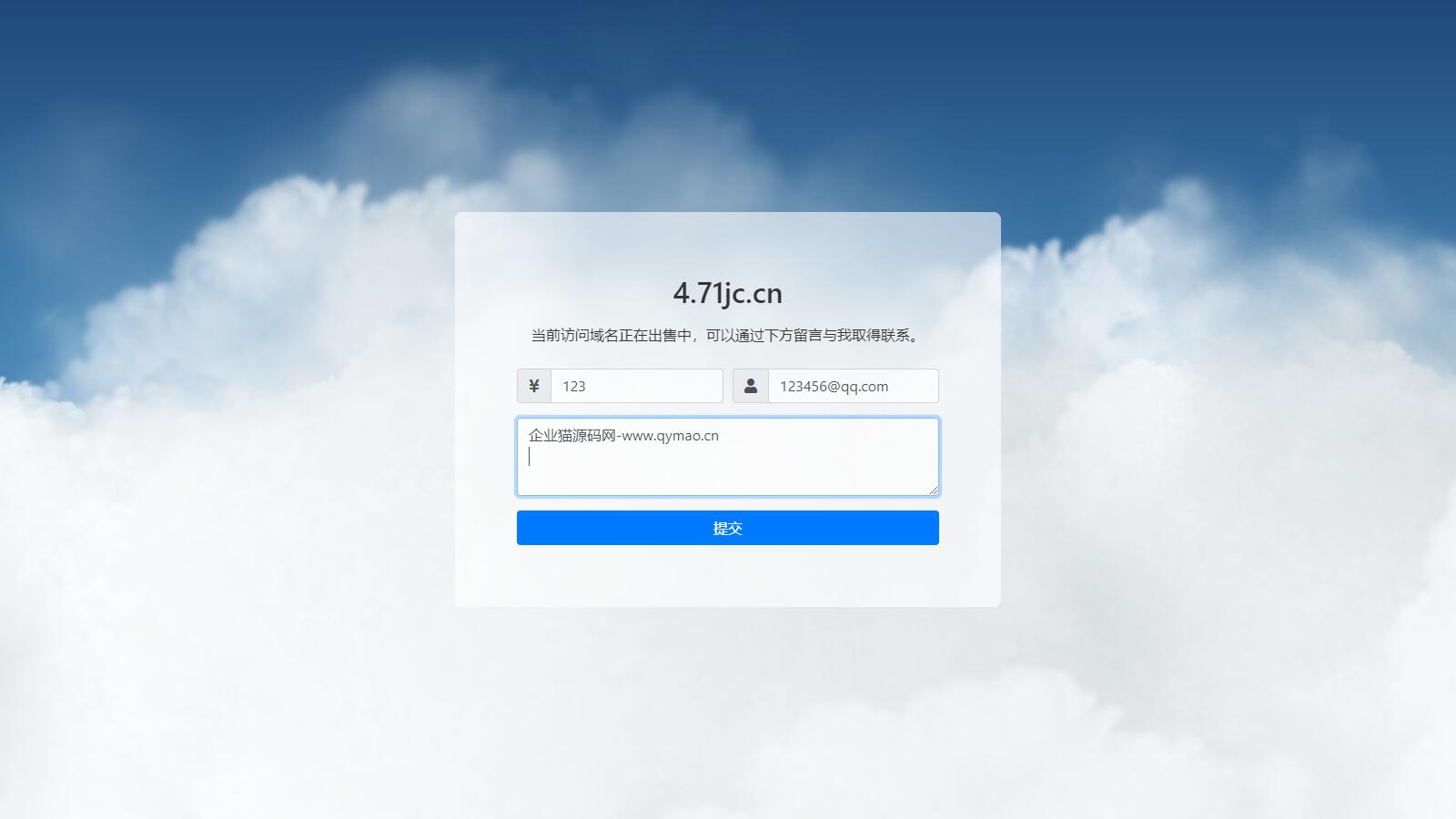 首先,我需要一个简单而美观的网页来展示域名的出售信息,并提供一个表单供用户填写他们的报价和联系方式。 这个页面的实现主要在index.php中完成。 在index.php中,我使用了Bootstrap 4来快速构建响应式布局, 并引入了Font Awesome图标库来美化表单输入框。页面的核心部分是一个表单,用户可以在这里输入他们的报价、联系方式以及留言信息。