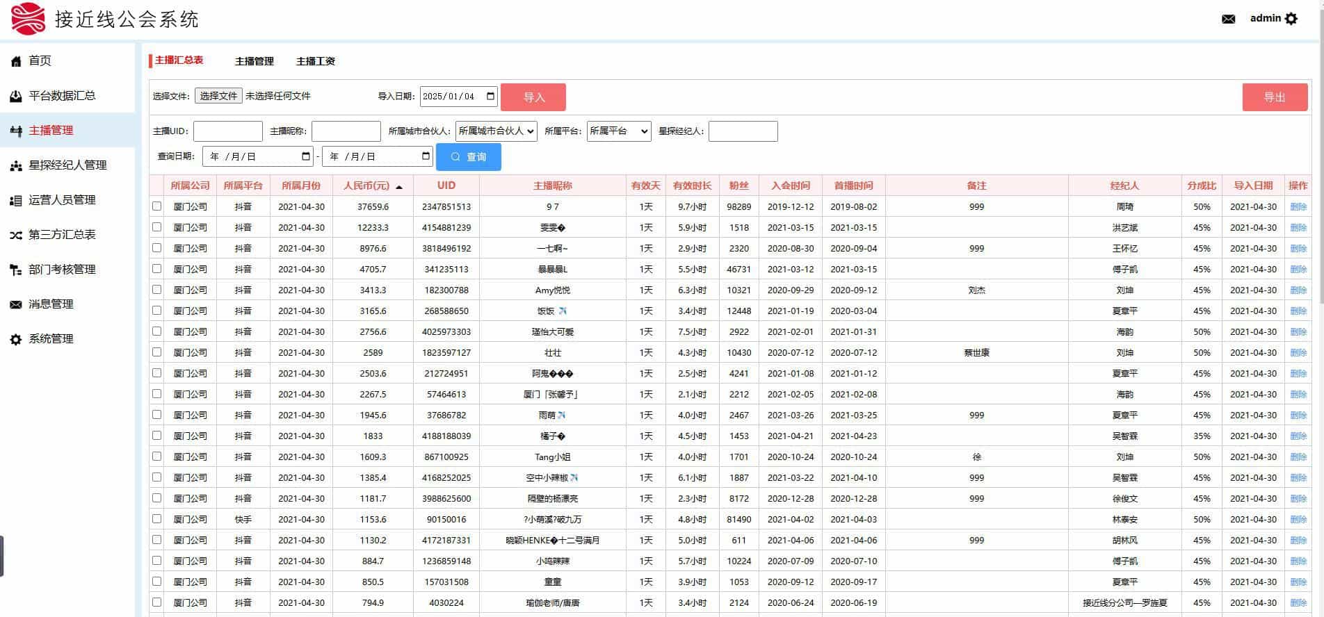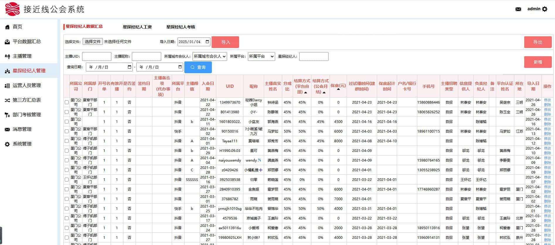 工会系统抖音快手等多平台主播分红分润系统星探经纪人城市合伙人多角色管理系统分红统计系统