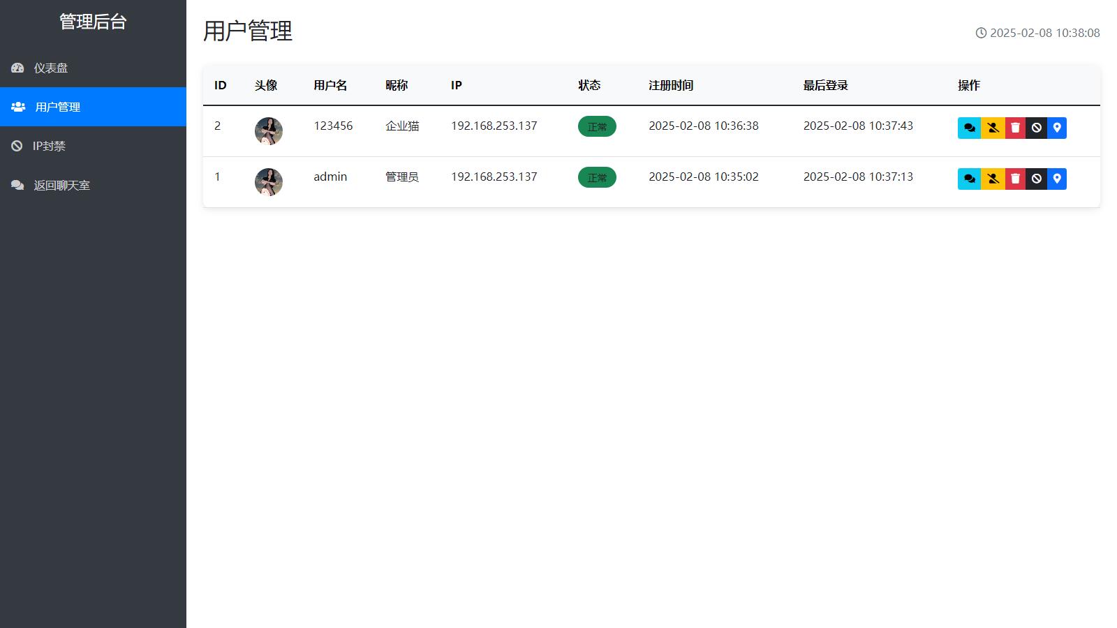 支持多人在线同时聊天 注册记录 ip,封禁 ip 功能