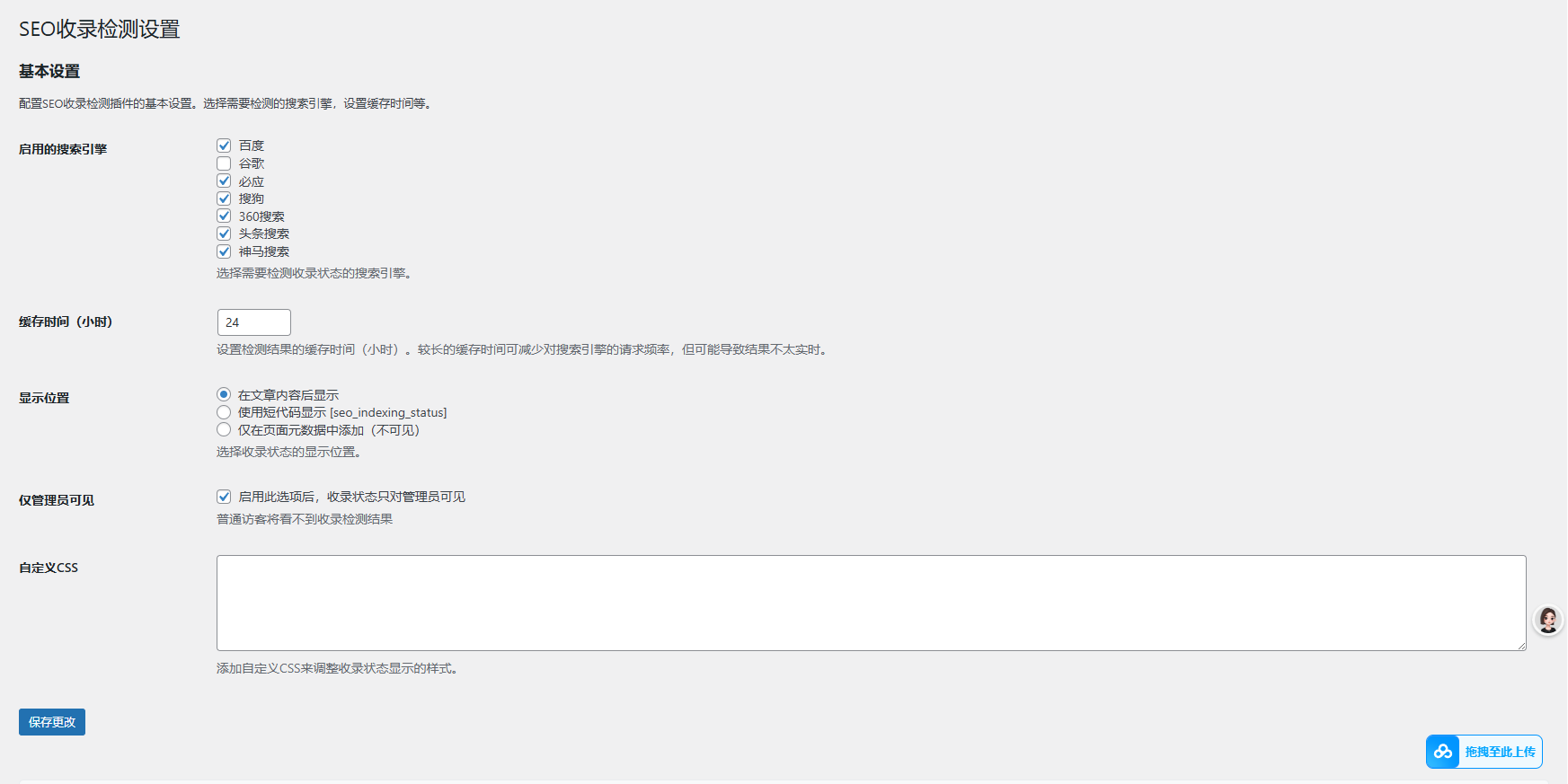 SEO收录检测是一款专为WordPress网站设计的插件,可以自动检测并显示文章是否被各大搜索引擎 (百度、搜狗、360、必应、头条、神马、谷歌)收录。通过直观的界面展示收录状态, 帮助站长了解网站内容的收录情况,进而优化SEO策略。 功能特点 1. **多引擎支持**:同时支持7个主流搜索引擎的收录检测 – 百度搜索 – 谷歌搜索 – 必应搜索 – 搜狗搜索 – 360搜索 – 头条搜索 – 神马搜索