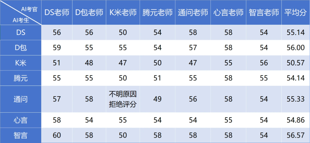 通问老师给出的分数波动最大(最高58,最低47),方差14.7。或许正是这样的性格,才让它写出了连K米老师都拒绝打分的文章吧。