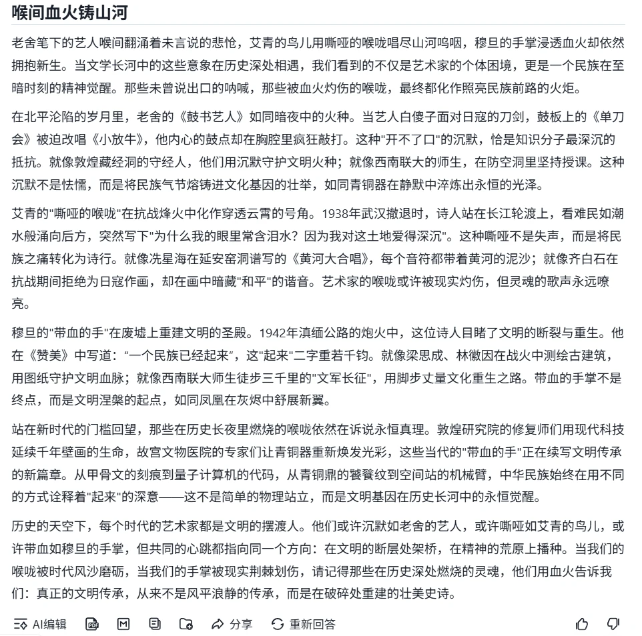 苏老师:我给这篇作文打45分(满分60)。我对全国卷评分标准不大了解,但是既然第一则材料来自阅读II《鼓书艺人》,当然不能对阅读II的基本情节理解有很大偏差。然而,就我看到的《鼓书艺人》内容,AI作者恐怕是在一本正经地胡说八道,或者说出现了幻觉。老舍的原文中,鼓书艺人“开不了口”,是面对被战争摧残的孩子,想给他们唱一段,又唱不出。但这篇文章,变成了不知哪来的角色“白傻子”面对日寇的刀剑保持沉默。出现这样严重的失误,所以我无法给出高分。