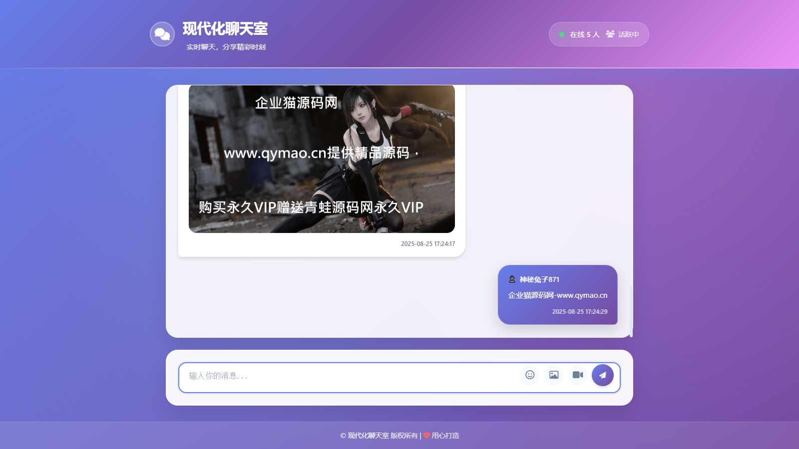 一款在线多人实时聊天室系统,支持表情包、图片、视频发送,支持每次发送消息随机用户名,无需数据库,无后台 测试环境:PHP7.4 更新: 修复视频无法上传问题 1.新建站点 2.上传源码到网站根目录解压 3.访问域名即可进入前台 4.给文件权限777 首页消息记录在chat_data.json文件里可清理 消息刷新时间在index.php文件第663行可设置,15000等于15秒
