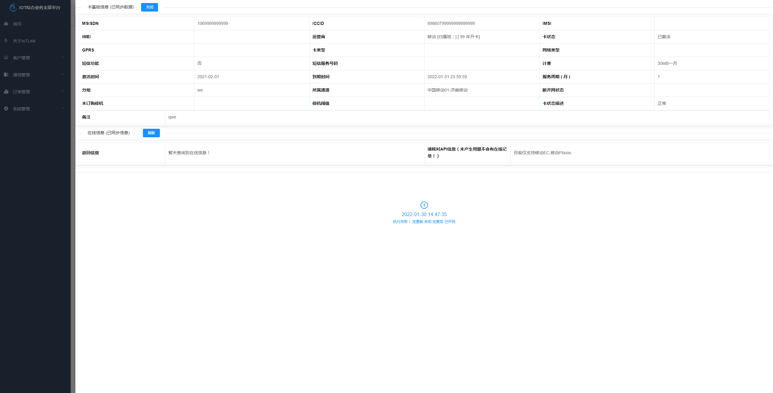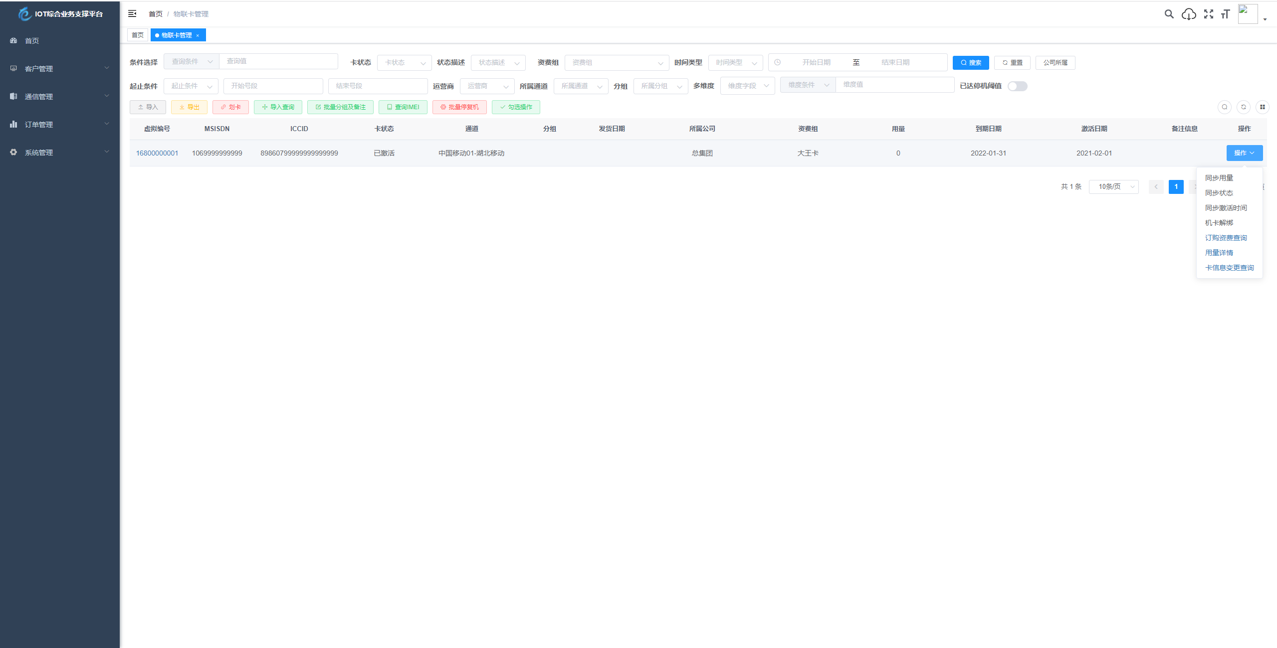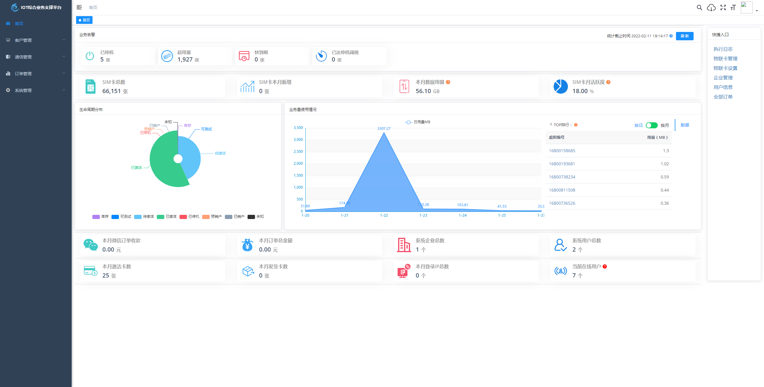 管理物联卡 用量记录、套餐封装、在线信息获取、智能诊断、分组备注、企业代理管理、预存、充值、返利 等。